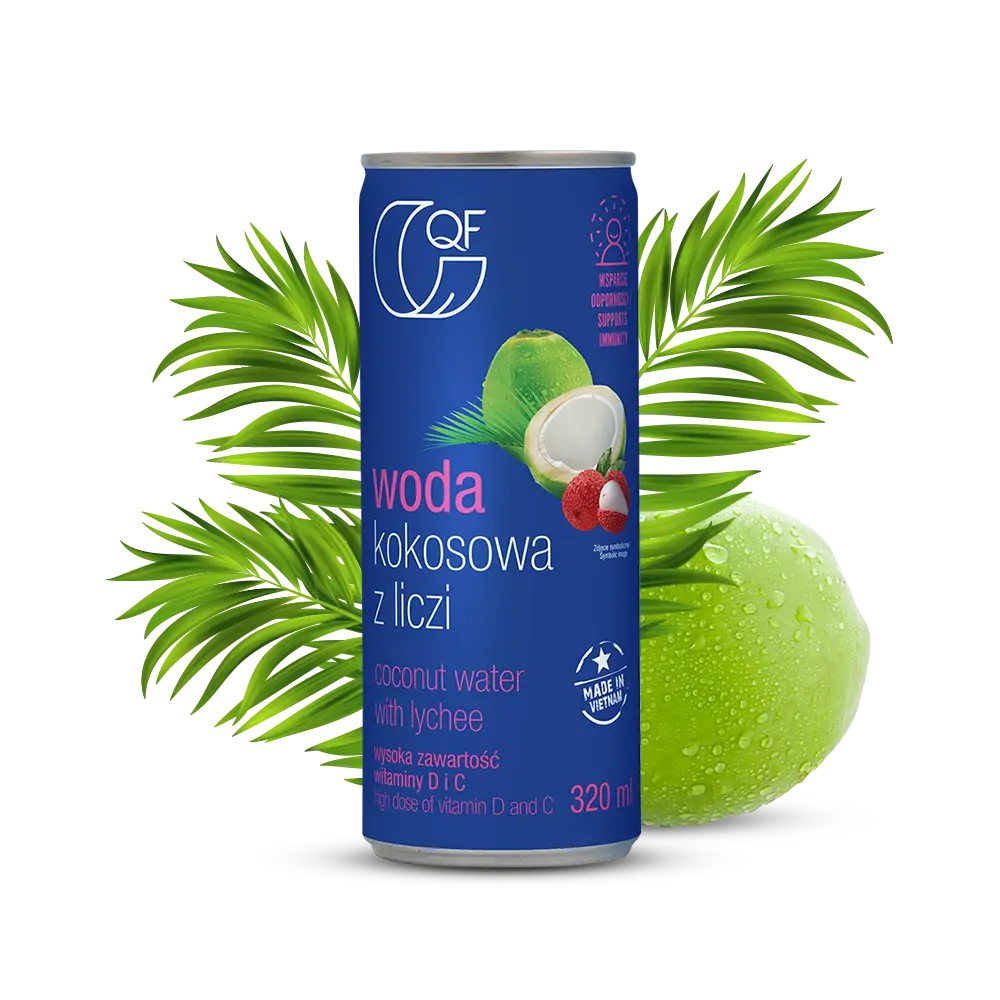 woda kokosowa 94,4 %, sok z liczi 5%, inulina, aromat, regulator kwasowości: kwas askorbinowy, substancja wzbogacająca: cholekalcyferol (witamina D).